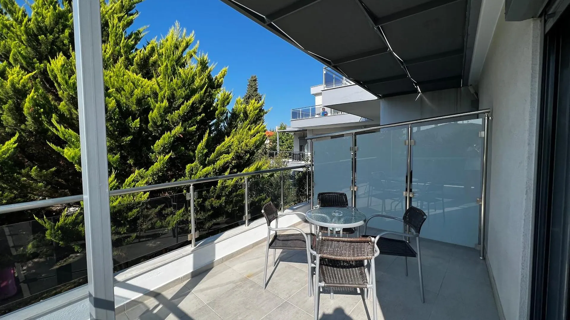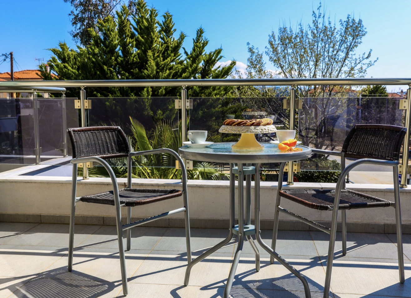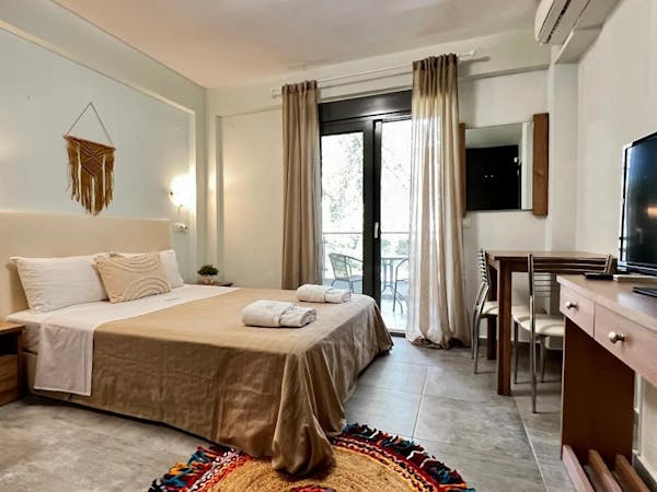 The Double Studio at Aquarius Nikiti offers 18 sqm space, ideal for couples or solo travelers. Studios are located on every floor—ground-floor units feature a private terrace, while upper-floor units include a balcony with a garden view, outdoor table, and chairs.