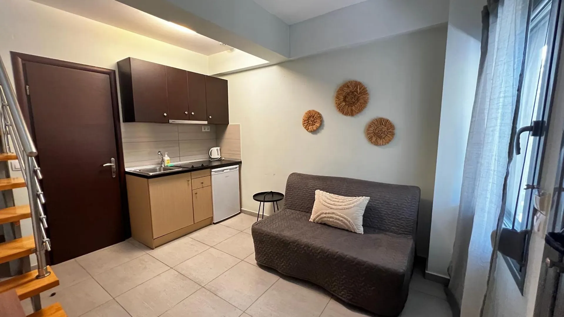 The Maisonette offers 31 sqm of comfortable, split-level space. It features a living room, a loft-style bedroom, and either a veranda or a terrace with a garden view.
